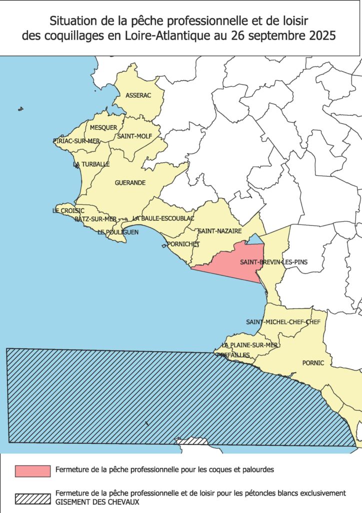 Carte de situation de la pêche des coquillages en Loire-Atlantique au 26 septembre 2025