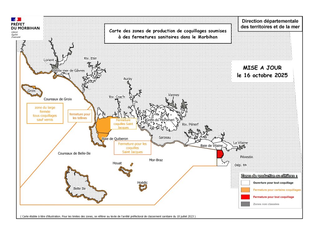 Suite à de nouvelles interdictions temporaires de récolter les coquillages depuis le 16 octobre 2025 sur les zone de La Vilaine et de la Côte de la Mine d’Or, la Préfecture du Morbihan a publié la carte actualisée ci-dessous des interdictions sanitaires sur les zones de production de coquillages du département sur son site internet.