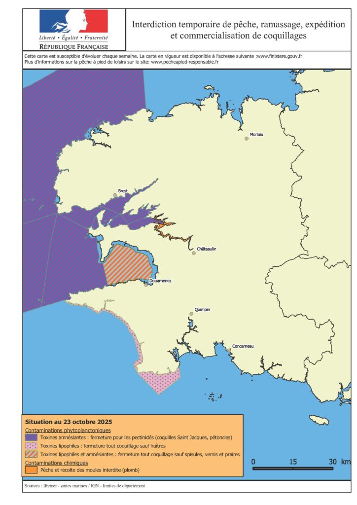 La Préfecture du Finistère a mis à jour la carte des zones de production de coquillages au 23 octobre 2025.