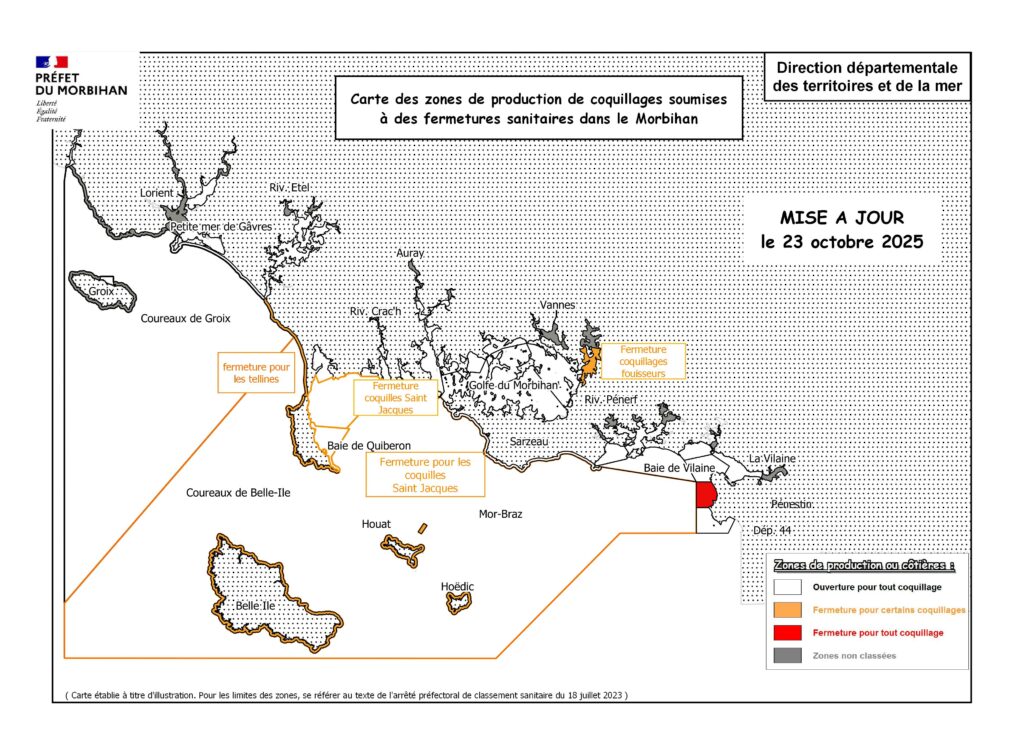 La Préfecture du Morbihan a mis à jour la carte des zones de production de coquillages au 23 octobre 2025.