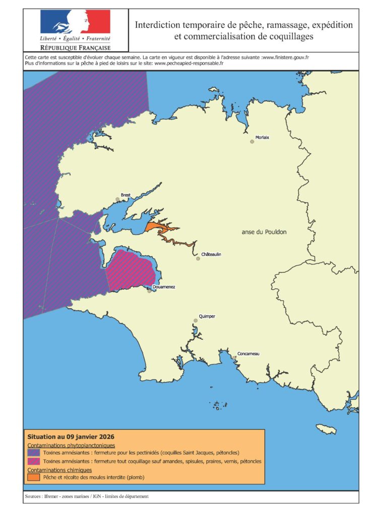 La Préfecture du Finistère publie régulièrement la situation sanitaire des gisements de coquillages au titre de la pêche et de l’élevage professionnels, à la suite des analyses concernant les toxines marines.