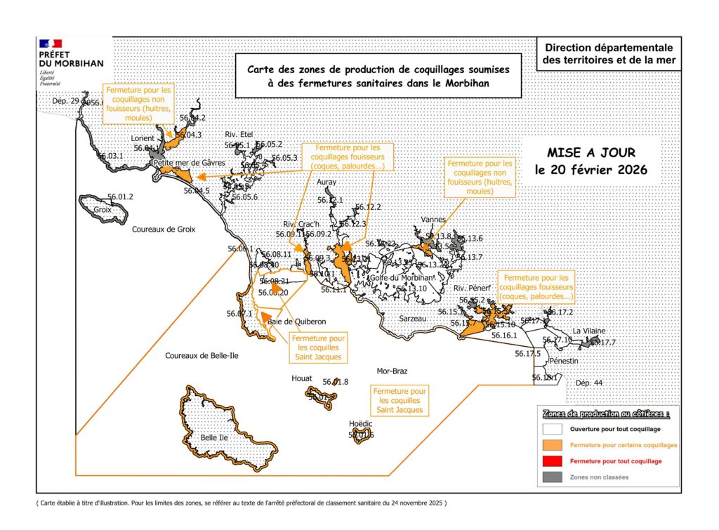 Évolution de la situation sanitaire des gisements de coquillages au 20 février 2026