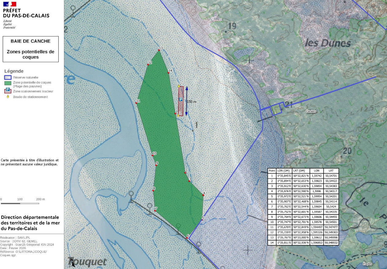 📄 Télécharger l’arrêté d’ouverture occasionnelle et la carte du gisement de coques de Sainte-Cécile en baie de Canche. Source : Préfecture du Pas-de-Calais. Publication du 6 mars 2026.