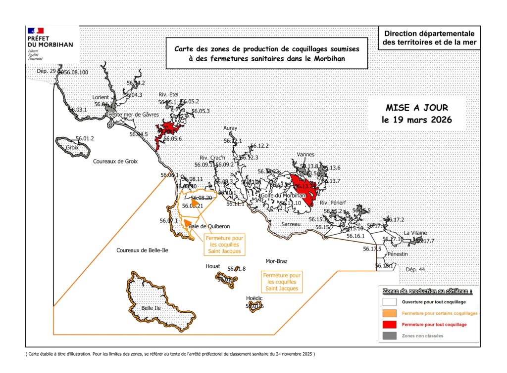 - Golfe du Morbihan Est – Fermeture pour les coquillages sauf les gastéropodes non filtreurs (bulots, bigorneaux…)