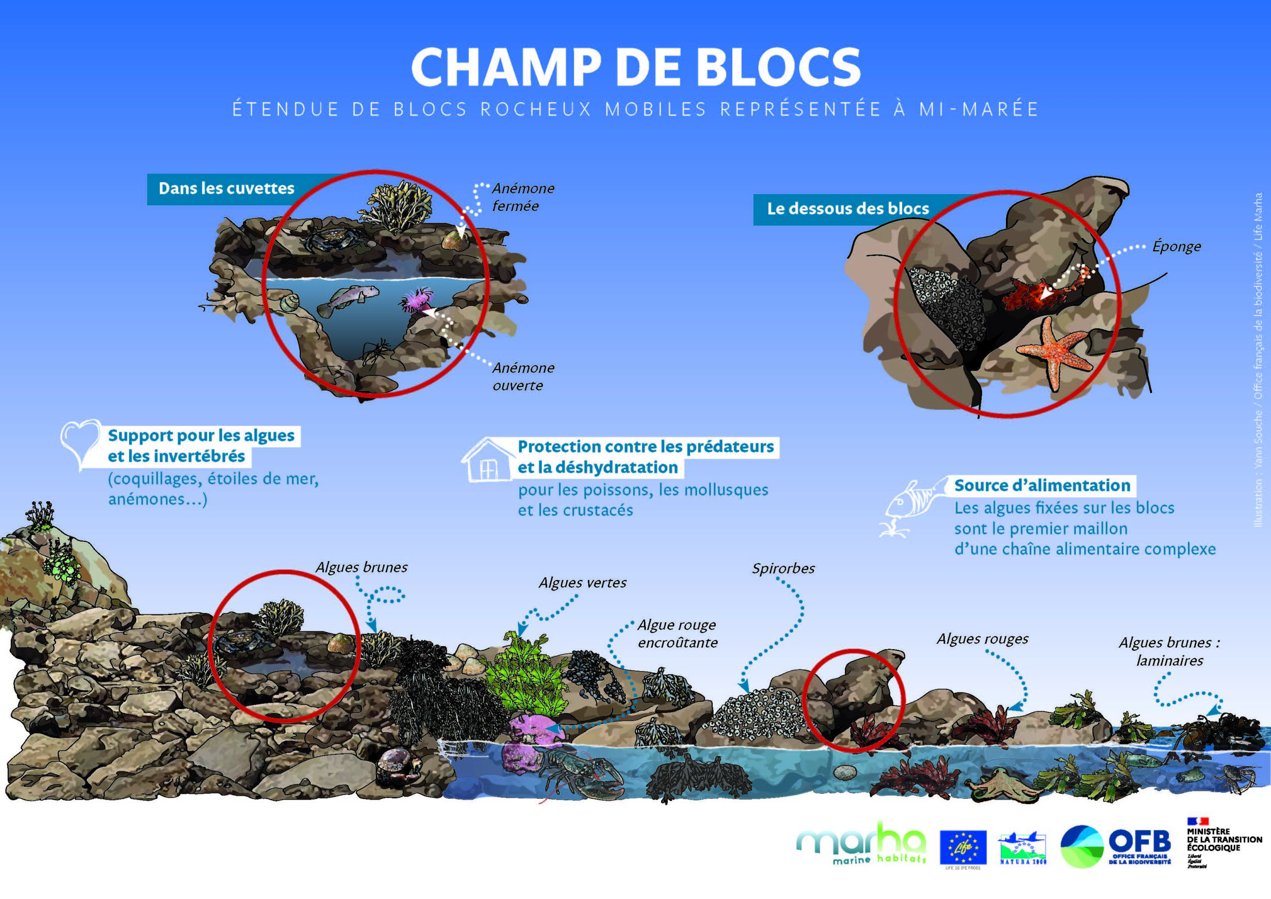 Le champ de blocs est une étendue de blocs rocheux qui découvre à marée basse lors des grandes marées. Cet habitat est généralement présent en arc de cercle entre deux pointes rocheuses ou au pied des falaises. Les blocs peuvent être de différentes tailles et formes, se superposer entre-eux ou recouvrir directement le substrat sous-jacent. Les roches qui les constituent sont également de poids variable, en fonction de leur nature : généralement du granit ou du calcaire sur nos côtes. Les blocs de calcaire sont plus légers et donc plus faciles à retourner par les pêcheurs et la houle… Ces milieux aux multiples recoins abritent une grande diversité d’espèces animales et végétales. Sur l’estran rocheux, c’est certainement les milieux les plus riches et ils sont particulièrement fréquentés par les pêcheurs de crabes, de crevettes ou encore d’ormeaux.